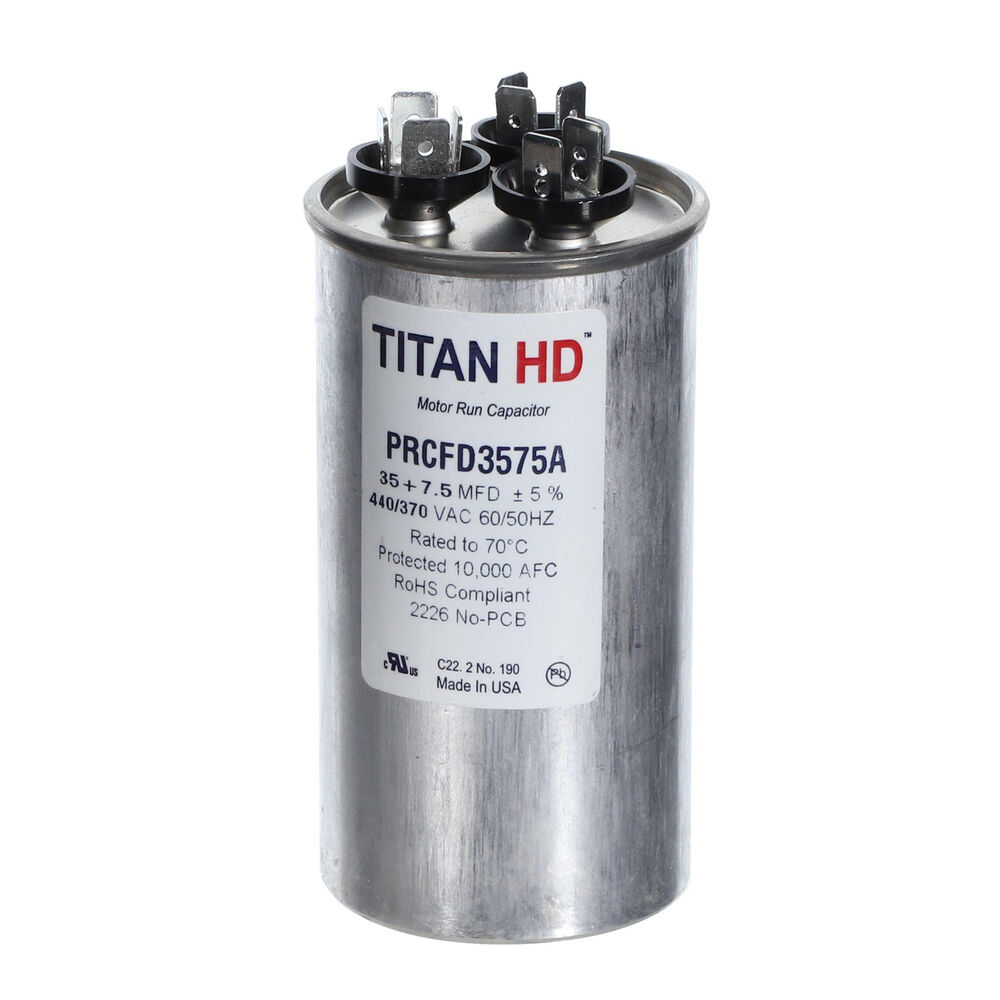 - TITAN HD PRCFD3575A RUN CAPACITOR 35+7.5 MFD 440/370 VOLT ROUND MADE IN THE USA