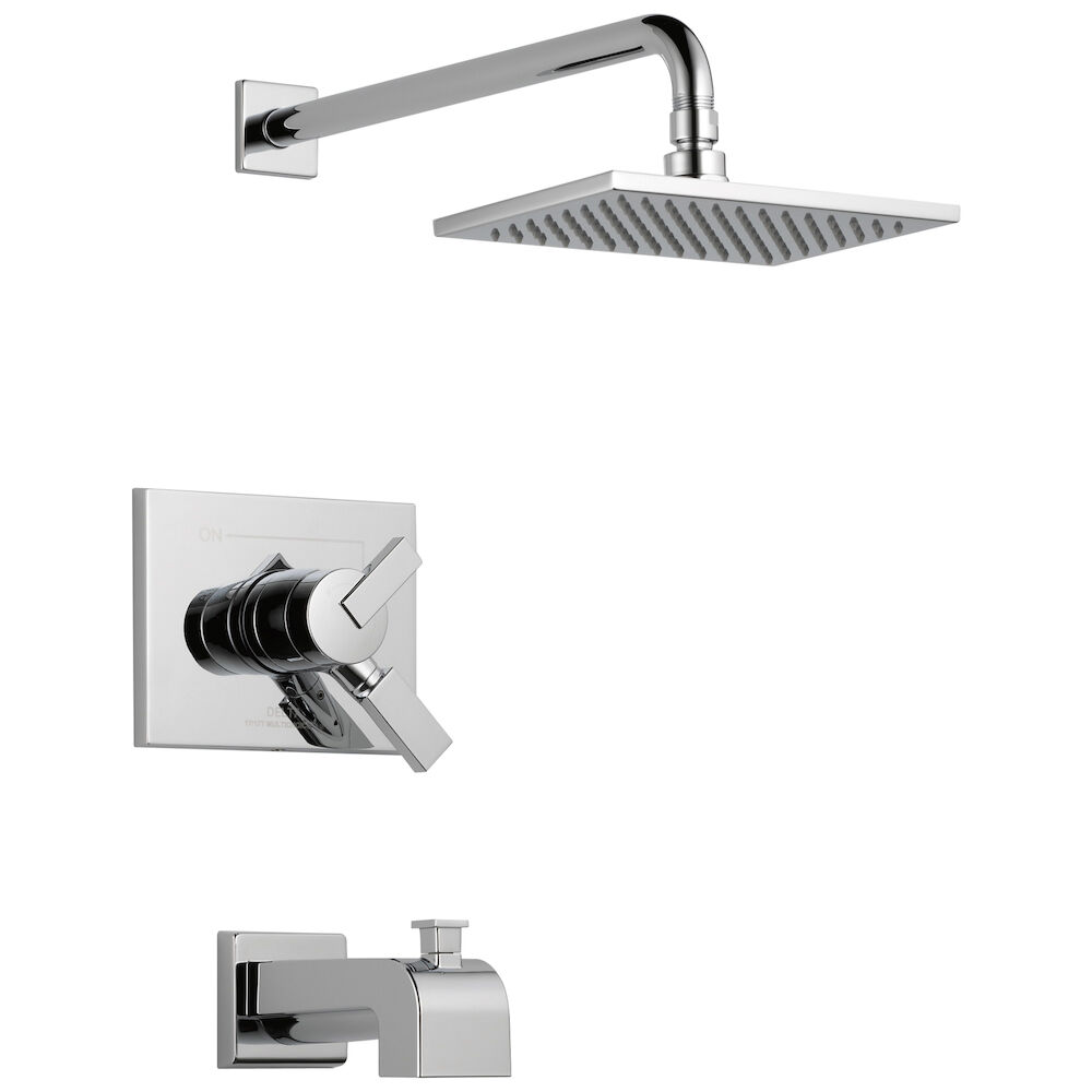 DELTA® Tub and Shower Faucet Trim, Series: Monitor® 17, Collection: Vero®, 1.75 gpm Shower Flow, Pull-Up Diverter Spout, 6-1/2 in Spout Reach, 1 Handles, Metal Lever Handle, 7-3/32 in L x 5-19/32 in H Trim, Pressure Balanced Valve/Cartridge, Hand Shower Yes/No: No, Spray Pattern: Full, 1 Spray Functions, Wall Mount, For Use With: For use with MultiChoice® Universal Rough-In Valve Body(R10000 Series), Brass, Chrome Plated, Domestic
