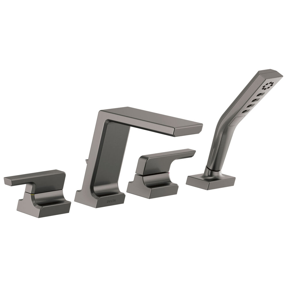 DELTA® Roman Tub, Pivotal™ Collection, 1.75 gpm Handshower Flow Rate, 8 to 16 in Center Distance, Fixed Spout, 9-1/4 in Spout Reach, 6-3/8 in Spout Height, 59 in Hose, Lever Handle, 2 Handles, 4 Faucet Holes, Spray Pattern: H2Okinetic® PowerDrench®/Massage/Pause, 3 Spray Functions, Hand Shower: Yes, Double Check Valve, 11-3/4 in W x 7-1/8 in H Dimensions, Brass, Lumicoat™ Black Stainless, Import, Commercial/Residential Commercial/Residential