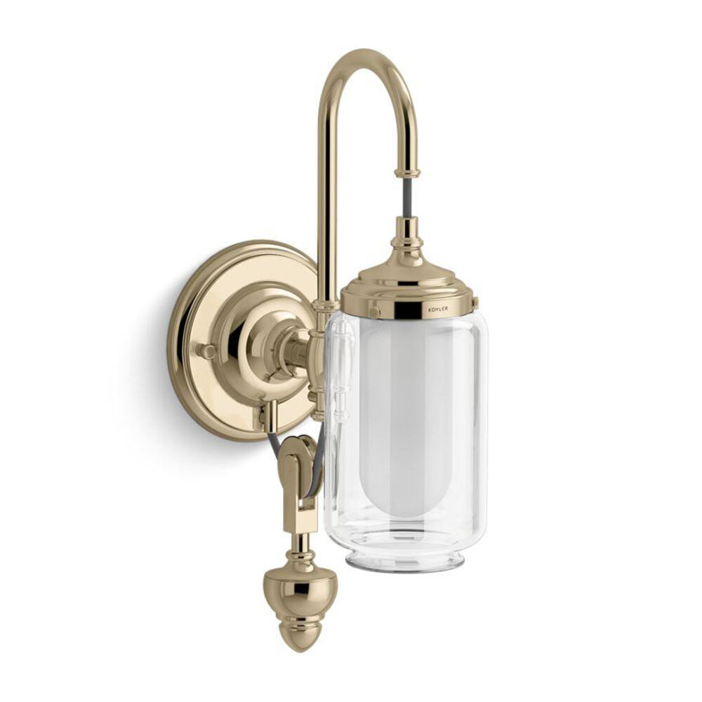 Kohler® 72581-AFL, Sconces, Adjustable, Series: 72581, Artifacts® Collection, 120 V, 60 W Fixture, Medium Lamp Base, 1 Lamp, Clear Glass Shade, Brass Housing Material, French Gold Housing Finish, 15 in H x 4.625 in W Dimensions
