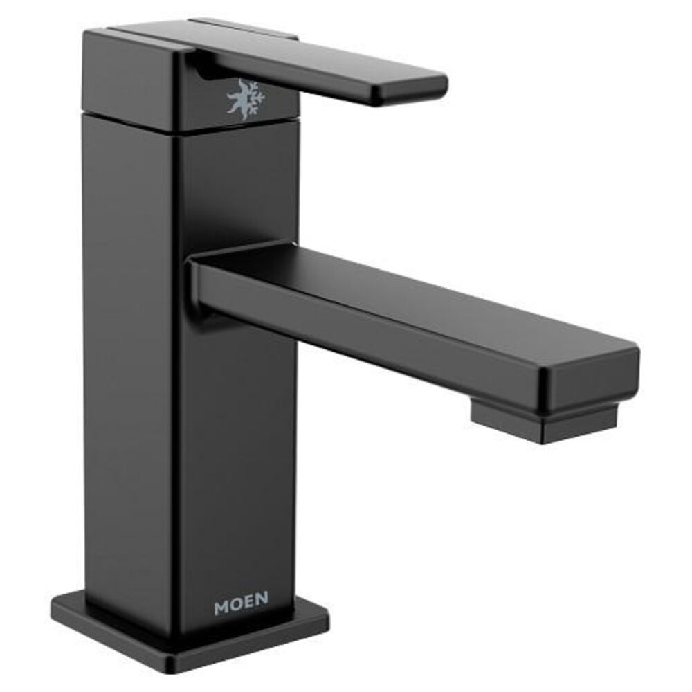 - Moen®, S6710BL, Bathroom Faucet, Low Arc, Series: S6710, 90 Degree™ Collection, 1.2 gpm Flow Rate, Fixed/Low Arc Spout, 5.25 in Spout Reach, 4.22 in Spout Height, Lever Handle, 1 Handle, Lift Rod Drain, 1 Faucet Hole, 3/8 in Connection, Compression Connection, Spray Pattern: Aerated Flow, Deck Mounting, 6.31 in H Dimensions, Metal, Matte Black