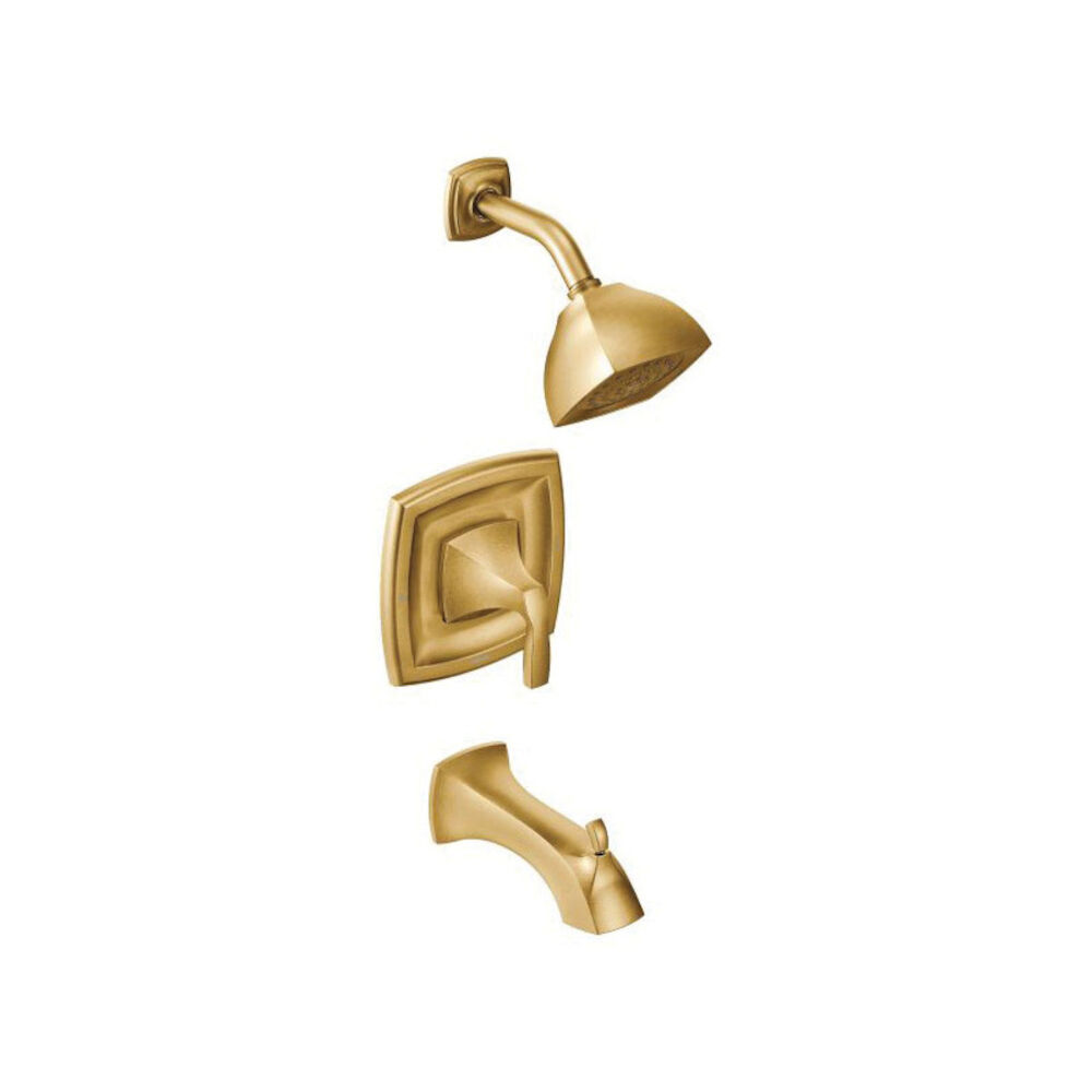 Moen® Tub and Shower Trim, Series: T2693, Voss™ Posi-Temp® Collection, Valve Flow Rate 1.75 gpm, Diverter Spout, 1 Handles, Lever Handle, 7-1/4 in Trim, Posi-Temp® Pressure Balanced Control Valve/1222 Cartridge, 1/2 in IPS Valve Inlet Connection, Hand Shower: No, Spray Pattern: Full, 1 Spray Functions, Wall Mounting, Metal, Brushed Gold, 7-1/4 in W x 8 in D x 7-1/4 in H Dimensions, Domestic, Commercial Commercial/Residential