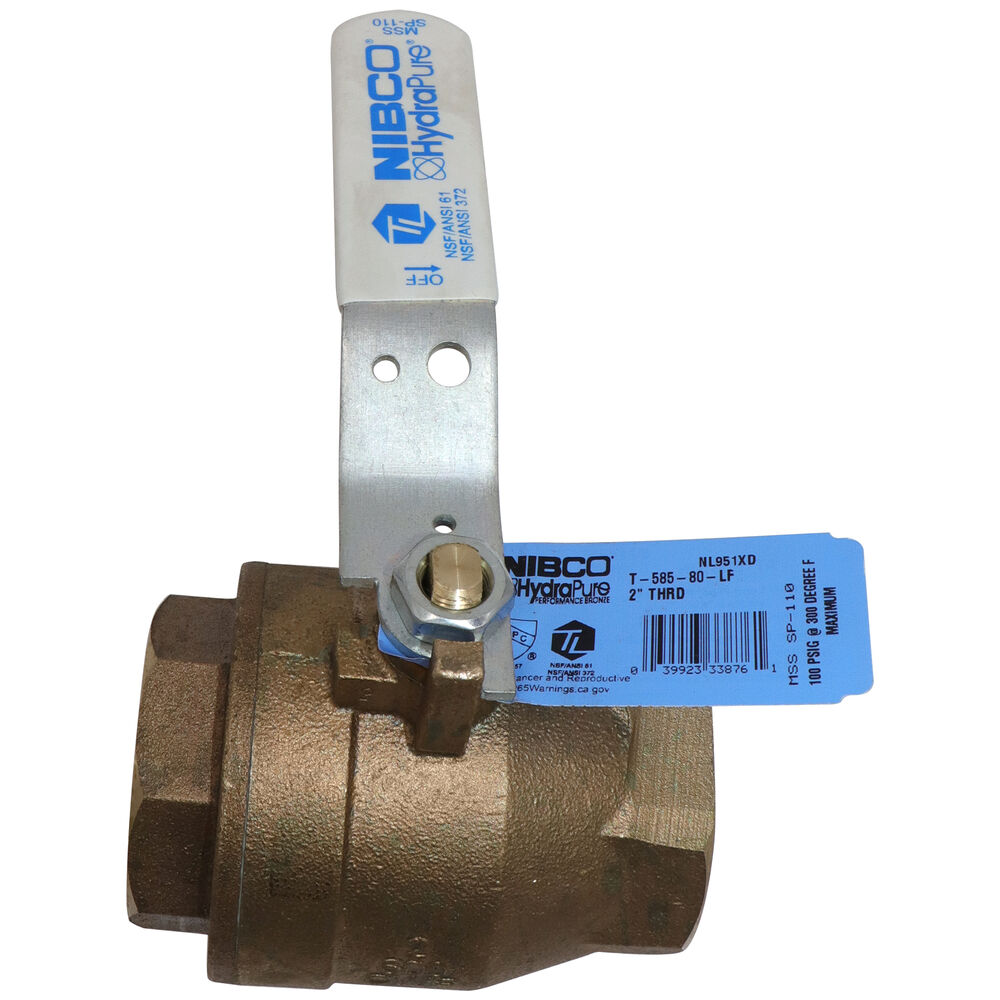 NIBCO® HydraPure® Ball Valve, Lead Free 2-Piece, Series: T-585-80-LF, 2 in Nominal, Thread End Style, 600 psi Pressure, 300 deg F, Full Port, Media: Water, 2 in Orifice, Standard Lever Actuator, Silicon Bronze Ball, 4.8 in Inlet to Outlet Length, 3.56 in Top to Inlet Center, Silicon Bronze Body, Silicon Bronze Stem Trim, PTFE Softgoods, Domestic