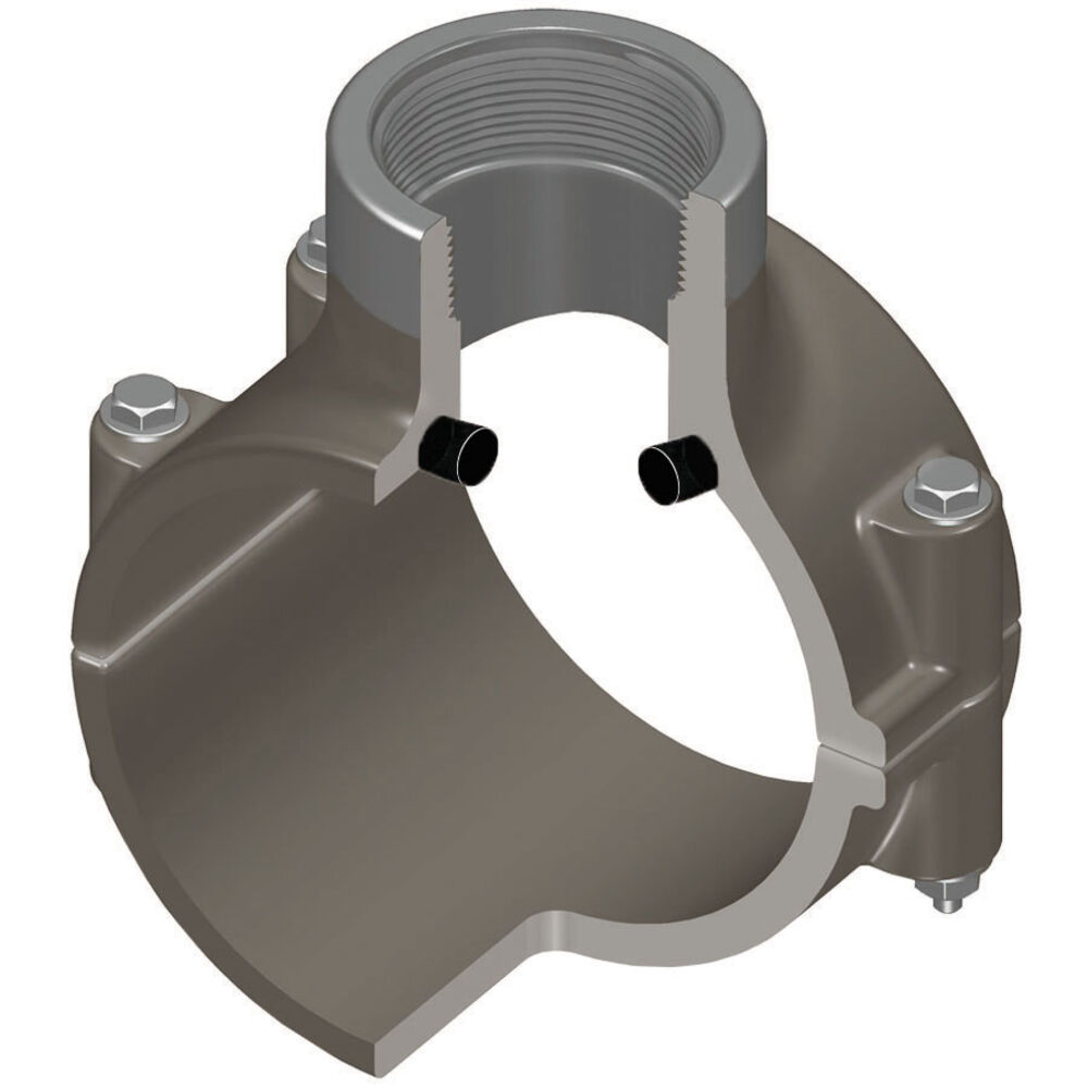 - Spears® Pipe Saddle, Clamp-On, 6 x 2 in Nominal, Special Reinforced FNPT Connection, 2-1/4 in Diameter Hole, SCH 80/XH Schedule, 200 psi Pressure, 73 deg F, Stainless Steel Bolt, PVC Clamp, 7-3/4 in W Dimensions, Gray, Domestic/Import: Domestic