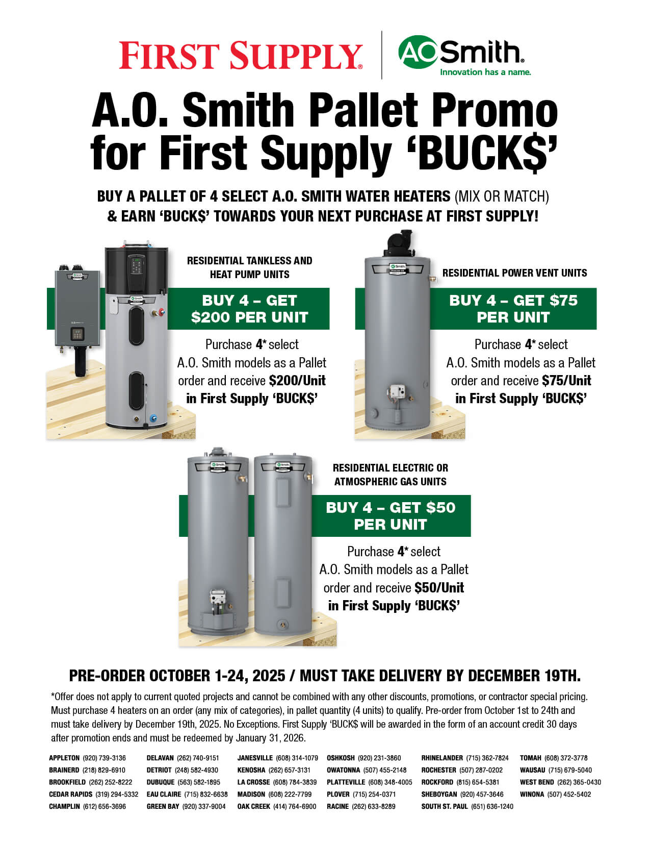 Purchase 4* select A.O. Smith models as a Pallet order and receive $200/Unit in First Supply ‘BUCK$’ -