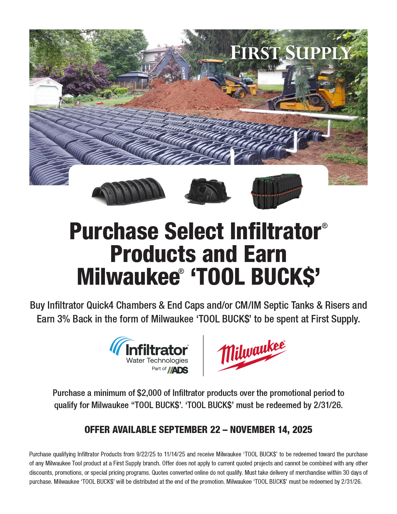Purchase qualifying Infiltrator Products from 9/22/25 to 11/14/25 and receive Milwaukee ‘TOOL BUCK$’ to be redeemed toward the purchase of any Milwaukee Tool product at a First Supply branch. Offer does not apply to current quoted projects and cannot be combined with any other discounts, promotions, or special pricing programs. Quotes converted online do not qualify. Must take delivery of merchandise within 30 days of purchase. Milwaukee ‘TOOL BUCK$’ will be distributed at the end of the promotion. Milwaukee ‘TOOL BUCK$’ must be redeemed by 2/28/26.