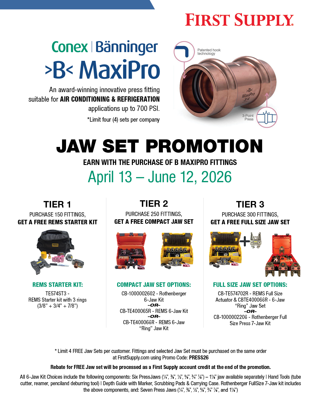 *Limit (4) FREE Jaw Sets per customer. Fittings and selected Jaw Set must be purchased on the same order at FirstSupply.com using Promo Code: PRESS26